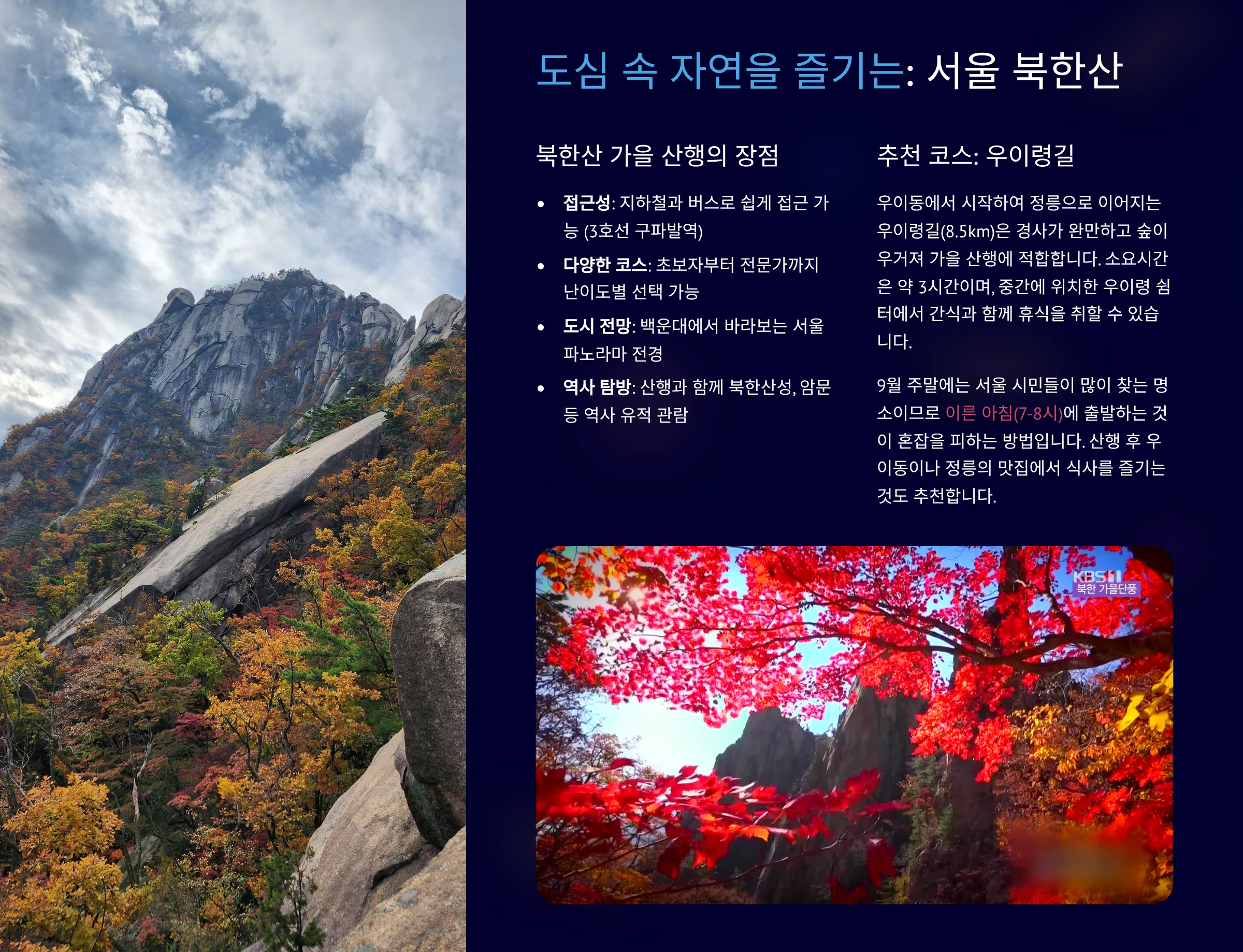 굳이 멀리 떠나지 않아도 서울 도심에서 가을 산행을 즐길 수 있는 곳이 바로 북한산입니다. 9월의 북한산은 한여름의 짙은 녹음과 함께 쾌청한 날씨 속에서 산행을 할 수 있어 많은 등산객들이 찾습니다. 서울 시내에서 접근성이 뛰어나고 다양한 난이도의 코스가 있어 남녀노소 누구나 즐길 수 있습니다.